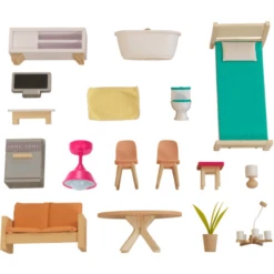 - Met 17-delige accessoireset in Amerikaanse stijl uit de jaren 1950: ovale tafel, fauteuil, kachel, bed, bijzettafel, kleine houten lamp, bank, grote plant, TV-standaard, TV, rechthoekig tapijt, salontafel, badkuip, hanglamp, hanglantaarn met verlichting, toilet met spoeleffect.