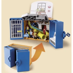 Een draagbaar operatiecentrum met twee speelbare niveaus, waaronder een gevangeniscel, wordt onthuld in de uitvouwbare koffer.