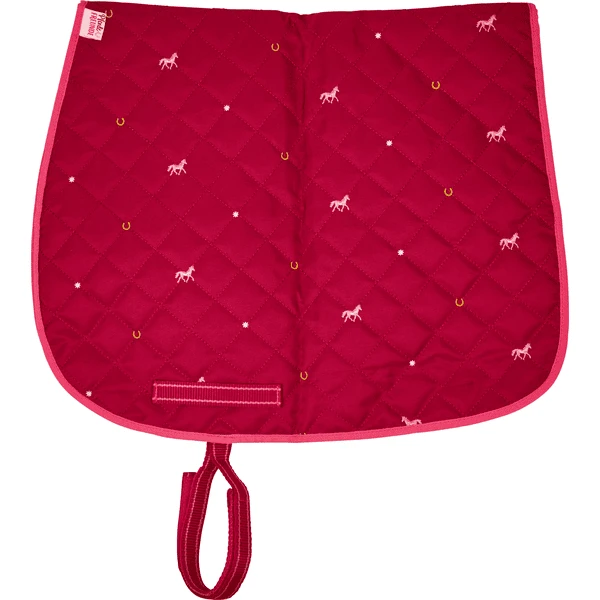 Gewatteerd zadeldek voor echte paardenliefhebbers en hun speelpaarden. Met mooi borduursel en klittenbandsluiting, geschikt voor gewone speelpaarden.